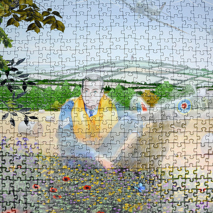 This patriotic jigsaw shows the memory of a World War 2 Pilot cast over a farmer's field. The history of the field still emanates as a serviceman and his trusted companion survey the poppies and wild flowers behind them. The memory of a Spitfire grounded behind them serves as a memory of times past.