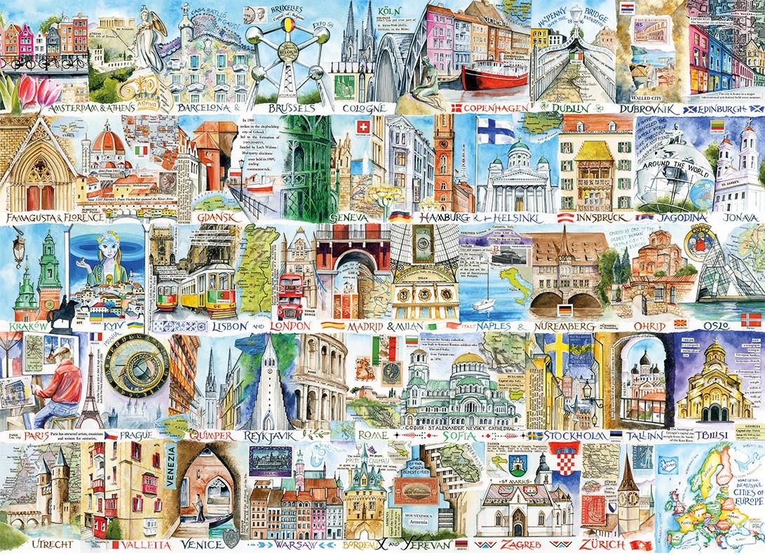 Take a trip through Europe with this 1000 piece puzzle featuring an A to Z illustration by Val Goldfinch. Explore the sights and sounds of the continent while piecing together this beautiful puzzle. Explore form Athens to Zurich and all the continents in between that makes this such a stunning scene to piece together.